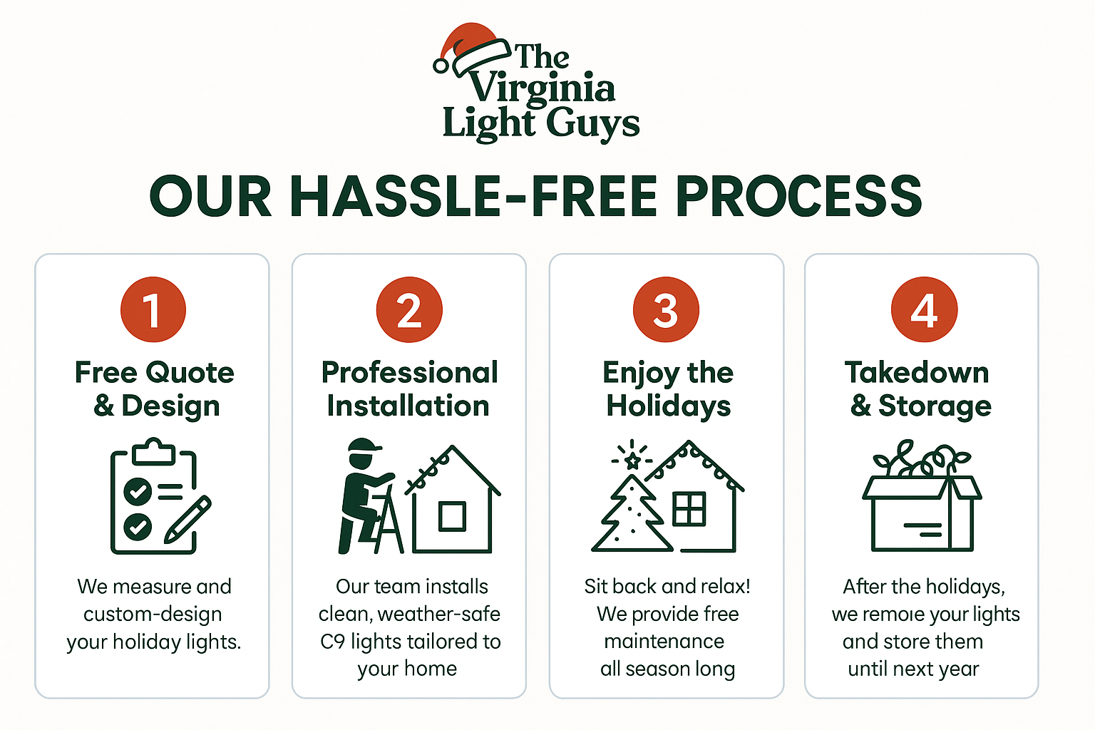 We proudly serve Richmond, Northern Virginia, and surrounding communities, ensuring professional Christmas light services across these regions.How does the installation process work?